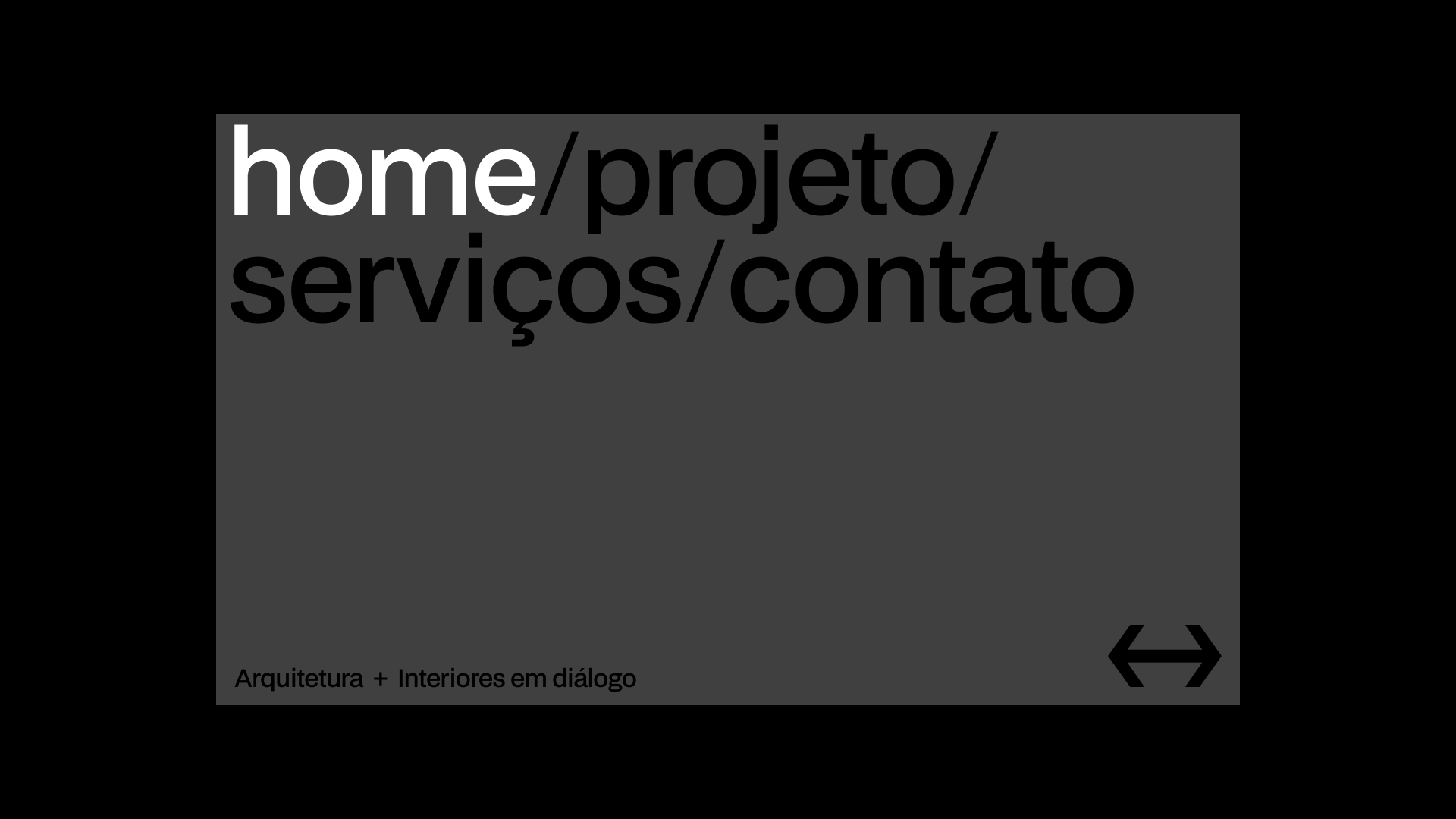Essa visão se traduz na identidade visual por meio de um sistema de logotipo variável. O logotipo traçado representa a arquitetura, ligada ao desenho e à estrutura. O logotipo preenchido representa os interiores, associados à matéria e à atmosfera. A seta apontando para os dois lados surge como elemento conceitual do projeto, simbolizando a conexão entre São Paulo e Rio de Janeiro e, ao mesmo tempo, o diálogo constante entre arquitetura e interiores que define sua atuação.