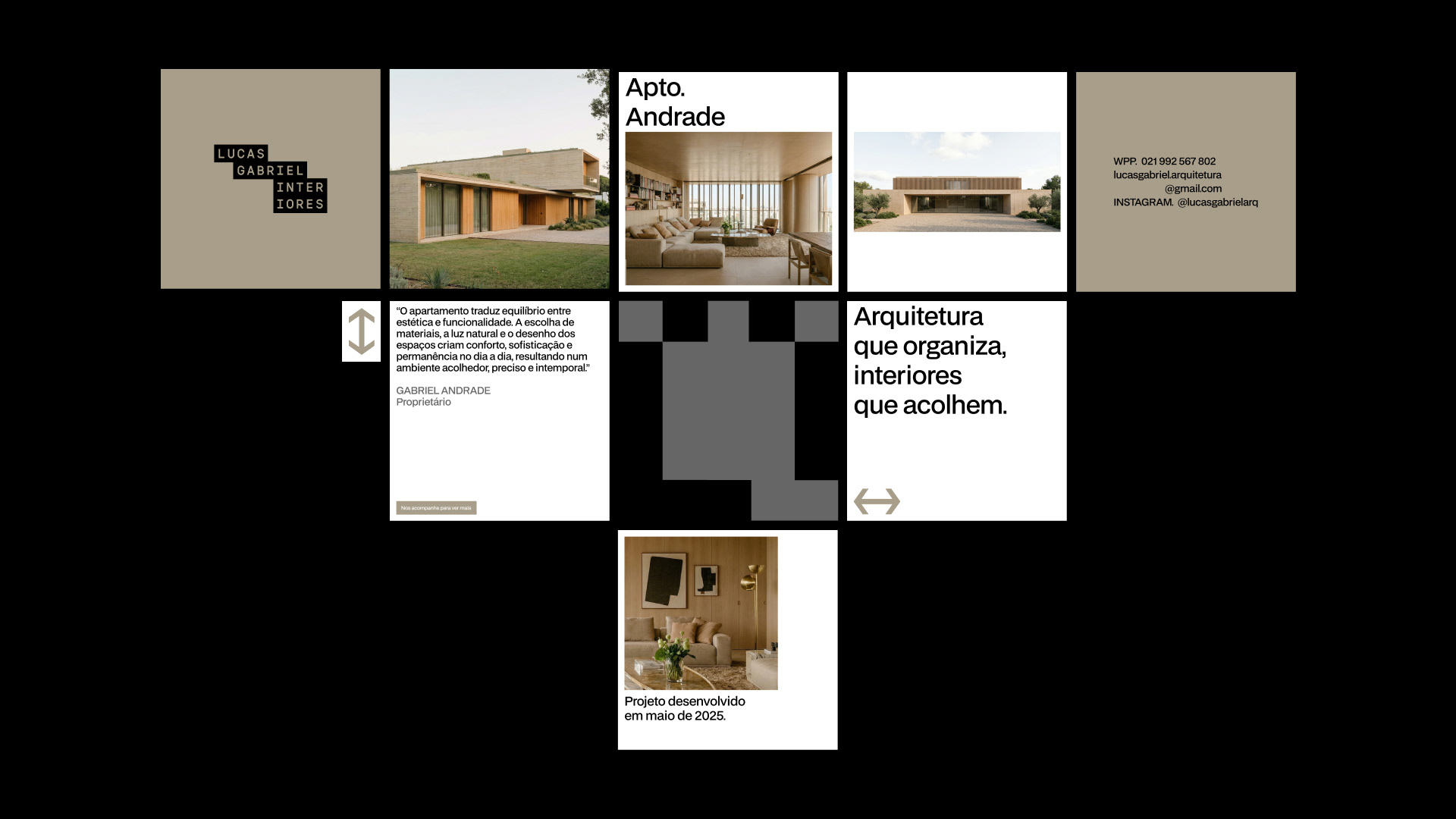 This vision is reflected in the visual identity through a variable logo system. The outlined logo represents architecture, connected to drawing and structure. The filled logo represents interiors, associated with materiality and atmosphere. The two-directional arrow appears as a conceptual element of the project, symbolizing the connection between São Paulo and Rio de Janeiro, as well as the ongoing dialogue between architecture and interiors that defines his practice.